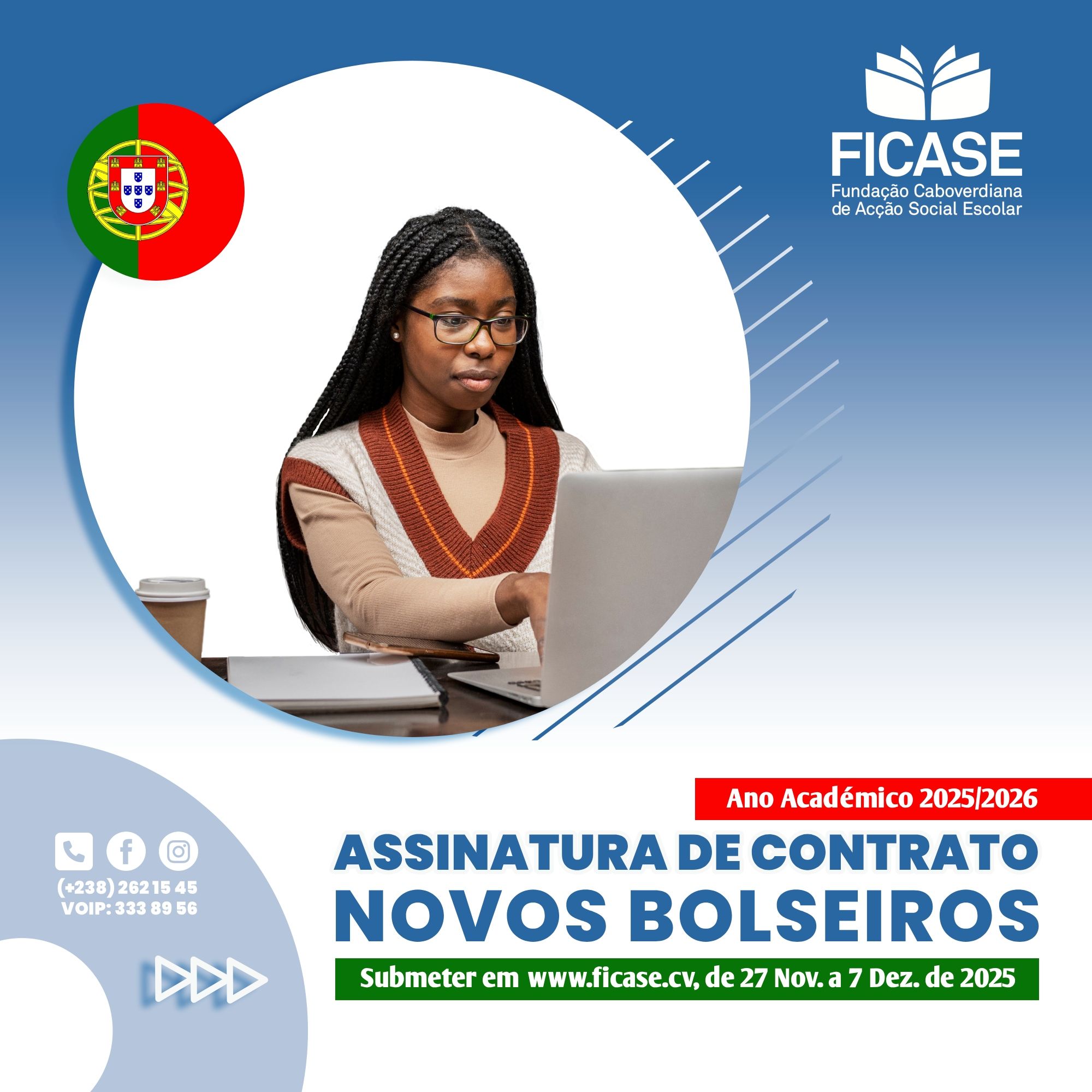 São convidados os “Novos Bolseiros do Governo de Cabo Verde, selecionados através do Concurso de Bolsas de Estudo para Licenciatura e Mestrado Integrado - Mérito, Social e Desempenho Escolar, em Portugal, Ano Académico 2025/2026, para procederem à Assinatura de Contrato com a FICASE (Fundação C ... Leia Mais