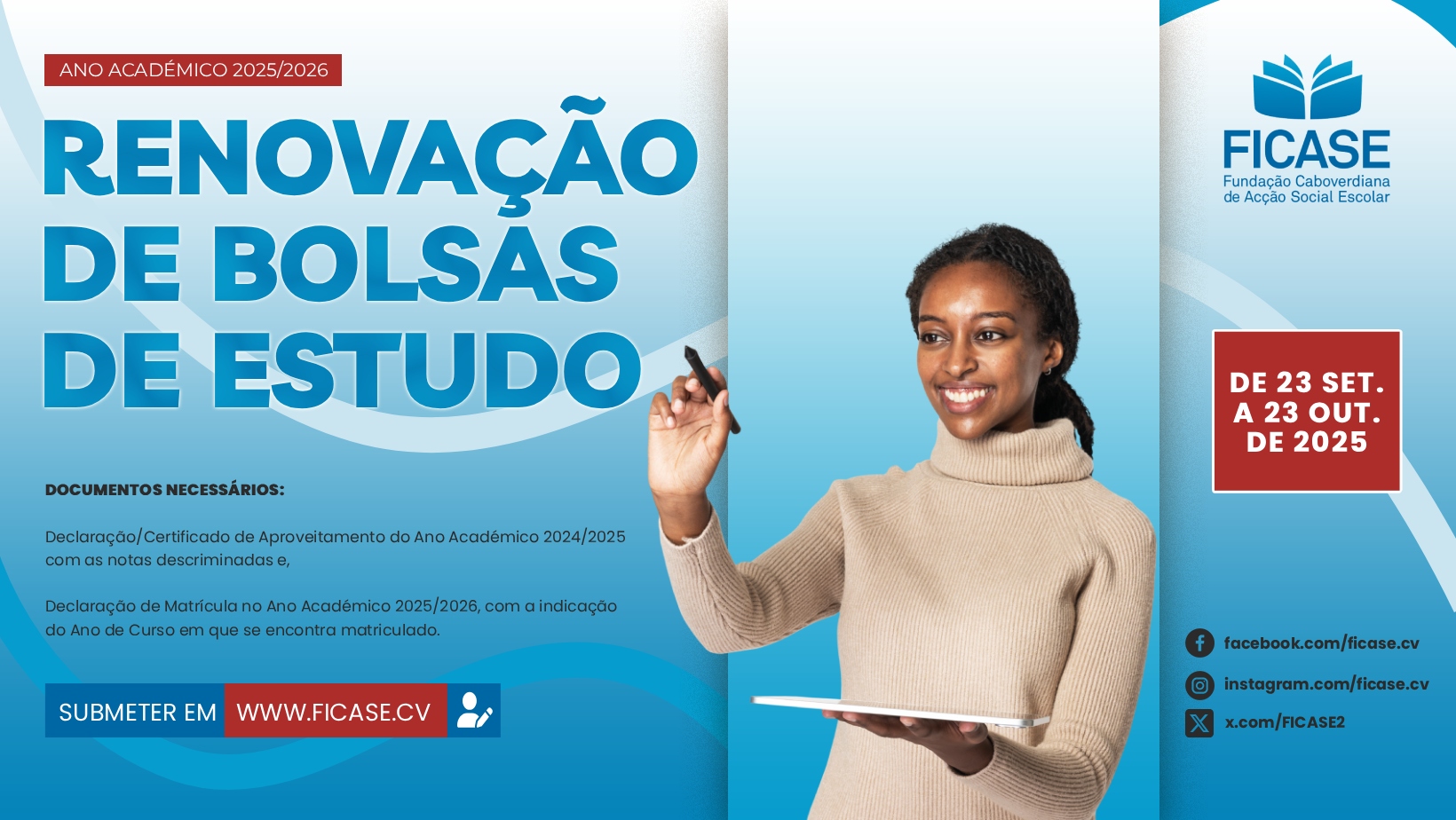 Renovação de Bolsa de Estudo, Ano Letivo 2022/2023, decorre de 12 de setembro a 21 de outubro, online. A Fundação Cabo-verdiana de Ação Social e Escolar (FICASE) avisa aos estudantes bolseiros, em formação superior no país, que o processo de renovação de “Bolsa de E ... Leia Mais